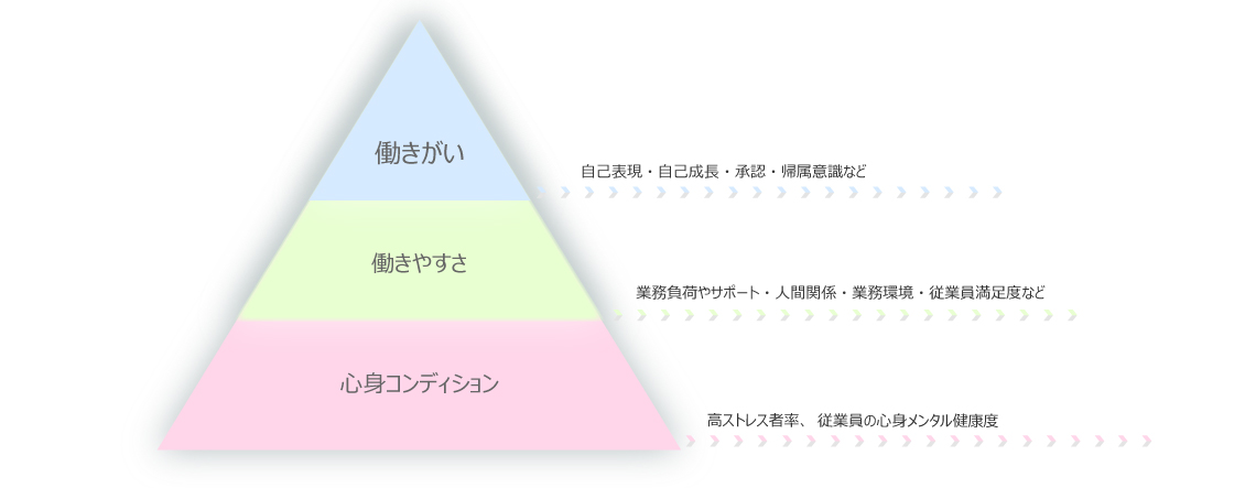 当社では、企業の力=組織生産性の1要素となる「組織活性」に対し、ストレスチェックのフレームを利用し、独自設問と組み合わせることで、「組織幸福度」「定着」の指標を用いて組織活性を「見える化」しています。組織活性に影響する3大要素、心身のコンディション、働きやすさ、働きがいを測るための評価軸を設定し、会社にとって本当に必要で有効な集団結果がアウトプットできることを目的に開発がされました。