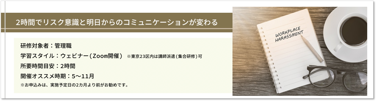 ・最新のハラスメント実態を学び、知識をアップデートする ・ハラスメント加害者として巻き込まれないための防止策や、ハラスメントと無縁な職場づくりの秘訣を習得する |