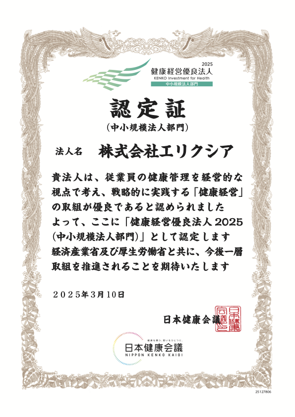 この度、2025年3月10日に経済産業省・日本健康会議が共同で選定する「健康経営優良法人2025(中小規模法人部門)」に認定されました。今回の認定により、昨年に続き2年連続の認定となります。