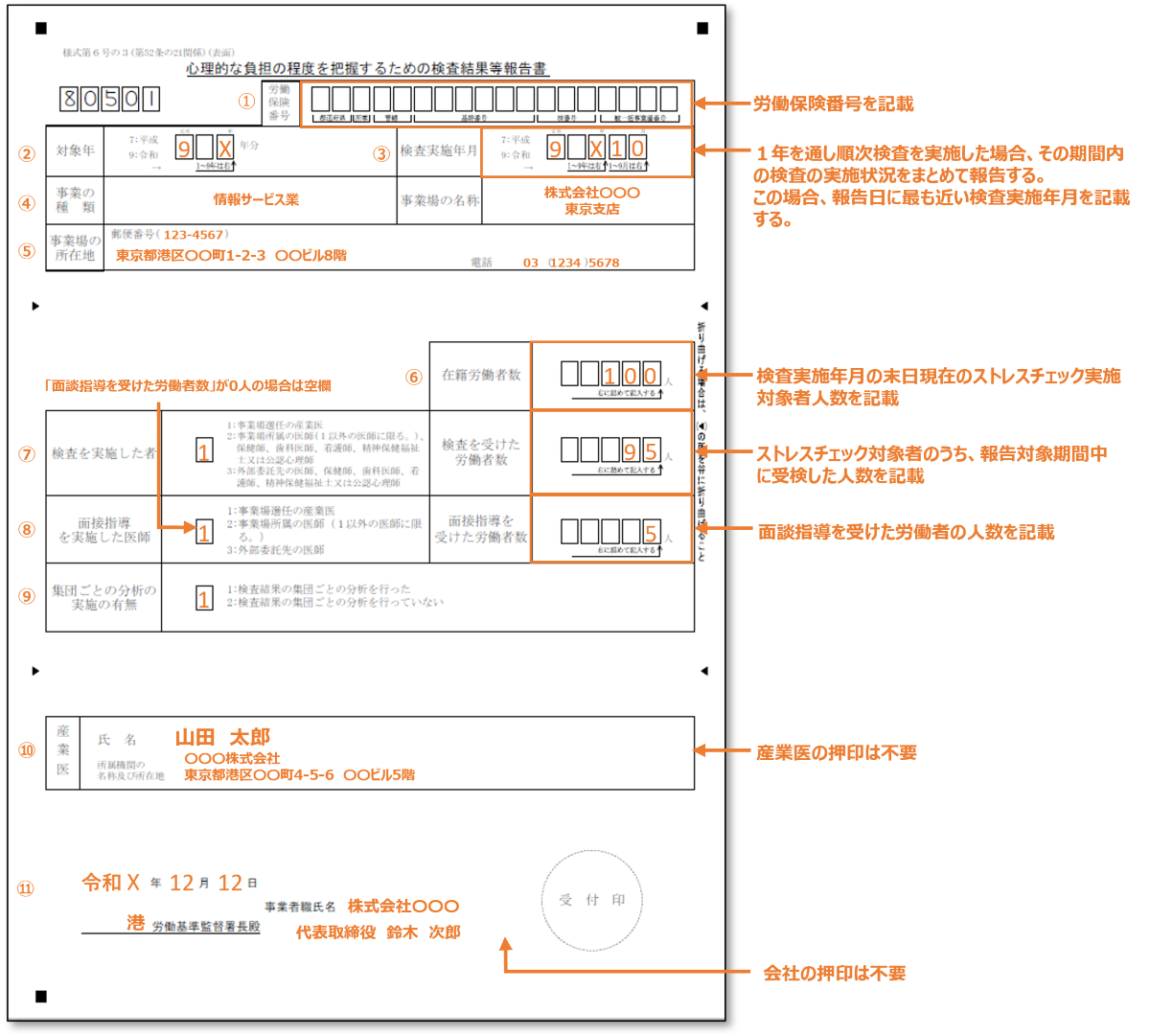 電子申請の原則義務化スタート|初心者でも安心!ストレスチェック結果報告書の電子申請について解説(記入例つき) 2022/12/08 2025/09/08 ストレスチェック ストレスチェック結果報告書―入力することは?いつまでにどう提出? ストレスチェック実施後の結果報告書の提出は、ストレスチェック制度の中で義務付けられている対応の一つです。本コラムでは、ストレスチェック実施後の結果報告書の入力内容、提出方法、提出期限について分かりやすく解説します。 また、結果報告書を提出するときに、よく質問されることについてもQ&Aでまとめていますので、つまずきやすいところも先回りして確認できます。初めて結果報告書を提出する方も、経験はあるけど作成方法や提出方法に自信がないという方も、ぜひ最後までお読みください。 この記事でわかること(目次)ストレスチェック結果報告書―入力することは?いつまでにどう提出?ストレスチェックは実施して終わりじゃないーストレスチェック結果報告とは?ストレスチェック結果報告書の作成・提出方法は? 2025年1月から!電子申請の原則義務化スタート【記入例つき】ストレスチェック結果報告書の入力内容結果報告書は1年以内ごとに提出ストレスチェック報告書の提出Q&Aおわりにストレスチェックは実施して終わりじゃないーストレスチェック結果報告とは? まず、ストレスチェック制度についておさらいしていきましょう。 ストレスチェックは、労働安全衛生法第66条の10に係る制度です。常時50人以上の労働者を雇用する事業場においては、年1回ストレスチェックを実施しなければならないと定められています。なお、50人未満の労働者を雇用する事業場は、ストレスチェックの実施は現時点で義務付けられていませんが、今後2028年ごろまでに実施が義務付けられることが決まっています。 ストレスチェックは実施して終わりではなく、ストレスチェックの実施状況について所轄の労働基準監督署へ報告する義務があります。報告の際は、労働安全衛生規則様式第6号の2「心理的な負担の程度を把握するための検査結果等報告書(以下、ストレスチェック結果報告書という)」を使用します。 ストレスチェック結果報告書の提出にあたっては、これまで労基署窓口へ直接届け出たり、郵送したりすることが可能でしたが、2025年1月から電子申請が原則義務化となっています。 (検査及び面接指導結果の報告)第五十二条の二十一 常時五十人以上の労働者を使用する事業者は、一年以内ごとに一回、定期に、電子情報処理組織を使用して、検査及び面接指導の結果等について、次に掲げる事項を所轄労働基準監督署長に報告しなければならない。(参照:e-Gov法令検索「労働安全衛生規則」) ストレスチェック結果報告書を提出しなかった場合は、労働基準監督署からストレスチェック実施状況の確認と、結果報告の申請について事業場へ連絡が来るケースがあります。労働基準監督署から指導を受けてもなお対応をしない場合、労働安全衛生法第120条の5に基づいて50万円以下の罰金が科される可能性もありますので、もし連絡がきた場合は速やかに提出状況を確認し、対応するようにしましょう。 ストレスチェック結果報告書の作成・提出方法は? 常時50人以上の労働者を雇用する事業場においてはストレスチェック結果報告書を所轄の労働基準監督署へ提出しなければいけません。たとえ、ストレスチェックを実施しなかった場合であっても、報告書を提出する義務があります。※50人未満の事業場は、現時点では報告の義務はありません。 また、ストレスチェックを実施したにもかかわらず受検者がいなかった場合でも報告書を提出する必要があります。報告義務については、労働安全衛生法第100条に基づくものであり、違反をした場合は罰則があるため注意しましょう。 それでは、ストレスチェック結果報告書の作成や提出方法について詳しく解説していきます。 2025年1月から!電子申請の原則義務化スタート ストレスチェック結果報告書は、2025年1月から電子申請が原則義務化となりました。※経過措置として、当面の間は電子申請が困難な場合、書面による報告も可能です。 結果報告書の作成から提出は、大きく3つのステップがあります。 STEP1:e-Govアカウントの作成 電子申請をするには、e-Govのアカウントを作成する必要があります。 詳細は、e-Gov電子申請のサイトをご参照ください。 STEP2:ストレスチェック結果報告書に必要事項を入力 厚労省の労働安全衛生法関係の届出・申請等帳票印刷に係る入力支援サービスで帳票を作成することができます。電子申請をする場合は、「電子申請を利用する方はこちら」をクリックし、e-Govにログインします。 次の章でご説明する必要事項を入力画面に沿って入力しましょう。 STEP3:ストレスチェック結果報告書を提出 全て入力したら、「帳票入力データを保存する」もしくは「申請内容(PDF)を出力する」をクリックして帳票のデータを保管しま