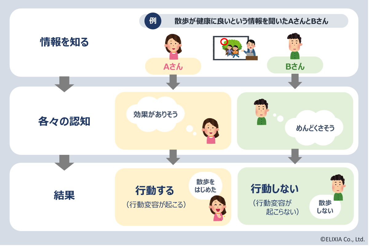 見えていますか?!4つのケアの繋がりと全体像 2023/09/15 2023/10/30 産業保健コラム [シリーズ]徹底解説!職場のメンタルヘルス対策4つのケア~具体例も手順もわかる③~ 4つのケアを繋ぐフレームワーク このシリーズでは全3回に渡って、4つのケアの取り組み事例を挙げながら、誰が、どんな方法や手順でメンタルヘルス対策に取り組むのが良いのか、具体的に解説しています。1つ目の記事では、「4つのケアの役割と具体例」について、2つ目の記事では「4つのケアの理想的手順」について解説しました。 最終回となる今回の記事では、4つのケアを効果的に連動させるための一例として、「認知行動変容アプローチ」に基づいたフレームワークを紹介します!ここまで見てきた4つのケアの具体的内容や手順に加え、最後に4つのケアを効果的に連動させるための繋げ方を見ていきましょう。 [シリーズ]徹底解説!職場のメンタルヘルス対策4つのケア~具体例も手順もわかる~1:大前提!職場のメンタルヘルス対策4つのケアの役割と具体例 2:成否の分かれ道?!メンタルヘルス4つのケアの理想的手順とは3:見えていますか?!4つのケアの繋がりと全体 ←今回はこちら この記事でわかること(目次)4つのケアを繋ぐフレームワーク4つのケアに共通して取り入れたい「認知行動変容アプローチ」認知行動変容アプローチとは?労働者一人一人の意識を変えにいく認知行動変容アプローチを取り入れるメリット認知行動変容アプローチの具体的取り入れ方セルフケアの場合ラインケアの場合事業場内の産業保健スタッフ等によるケアの場合事業場外資源によるケアの場合4つのケアの連動させるフレームワーク①認知行動変容アプローチを取り入れたセルフケア・ラインケアの実施②ストレスが継続しメンタル不調が発生した場合③最終目標はセルフケア能力の底上げまとめメンタルヘルス対応に関する課題はエリクシアで解決!4つのケアに共通して取り入れたい「認知行動変容アプローチ」 「4つのケアは導入されたが、いまいち成果が見られない・・・」 よく人事の方から聞くお話です。実はこの話には大きな問題が潜んでいることがあります。それは「仕組みが変わっても、労働者自身の行動はほぼ変わっていない」という問題です。結局、メンタルヘルスケアは仕組みを作った後、仕組みや知識に沿って労働者一人一人が行動することで成り立ちますが、人によっては、心の健康を守るような行動を全くしていないケースもあります。この問題は、研修を実施すれば解決することでもありません。研修で学んだことの受け止め方は人それぞれで、中にはあまり響かない人もいるからです。 そこで注目されているのが、「認知行動変容アプローチ」です。認知行動変容アプローチはどんなものにも効く万能薬ではありませんが、この手法を取り入れているか否かでメンタルヘルス対策の成果に差が生まれるといっても過言ではありません。 さっそく「認知行動変容アプローチ」について確認していきましょう。 認知行動変容アプローチとは?労働者一人一人の意識を変えにいく メンタルヘルス対策を実行しても、結局労働者一人一人の行動が変わらなければ、成果は出ません。加えて労働者一人一人の行動を変えるためには、人事が一方的に情報を発信するだけでは不十分です。 行動を変えるために必要なこと、それは「認知へ働きかけること」です。認知への働きかけとは、つまり「考え方や判断基準の枠組みを変えていくこと」です。 例えば、4つのケアが導入された企業で、セルフケアとして睡眠の質を向上させるための健康情報が提供されるようになったとします。それだけで興味・関心を持って行動する人もいますが、中には、「本当にこの情報は正しいのかな?」「分かってはいるけどやる気が起きない」「どうせ意味がない」など、否定的に考える人もいます。 このように、情報を取り入れて自分の行動を変えること、つまり行動変容の発生有無は、個人個人の認知(考え方・判断)に左右されます。 この「認知を変える」というハードルを越える一つの方法として注目されているのが、「認知行動変容アプローチ」です。 認知行動変容アプローチを取り入れるメリット 認知行動変容アプローチに基づいたセルフケアやラインケアを社員教育に導入すると、下記の様な面で効果が得られると、様々な研究で明らかにされてきています。 認知行動変容アプローチを取り入れるメリット・メンタル不調の発生予防・生活習慣病の発生予防 快適な睡眠習慣の定着 適度な運動習慣の定着 健康的な食生活の定着 飲酒習慣の改善・労働者のストレス対処能力の向上・職場内外でのコミュニケーションスキルの向上・生産性の向上 認知行動変容アプローチの具体的取り入れ方 では、4つのケアそれぞれに認知行動変容アプローチをどのように取り入れるのか、どんな効果があるのか、具体的に見ていきます。 セルフケアの場合 セルフケアは、通常研修を行う場合、“