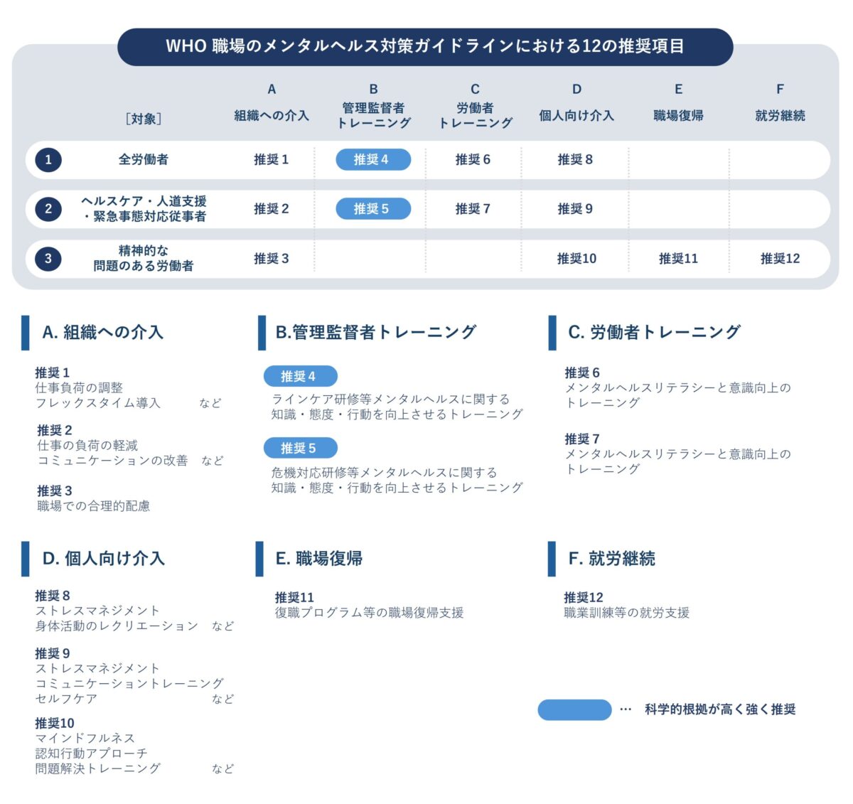 WHOも推奨!効果的なラインケア研修を企画するための3つのチェックポイント 2024/11/12 2025/11/18 産業保健コラム [シリーズ①]管理職が喜ぶラインケア研修の実施方法 職場のメンタルヘルス対策で特に効果的だと示された「ラインケア研修」 職場のメンタルヘルス対策の優先施策として「ラインケア研修」に力を入れる企業が増えてきています。 本記事では、ラインケア研修はなぜ他のメンタルヘルス系研修より重視されているのか、また効果的なラインケア研修を実施するために、企画段階で押さえておきたいポイントについて解説します。 管理職が喜ぶラインケア研修の実施方法シリーズ[シリーズ①]WHOも推奨!効果的なラインケア研修を企画するための3つのチェックポイント[シリーズ②]管理職のリアルな声!部下のメンタルヘルス対応で本当に困っていること[シリーズ③]受講者の感想から紐解く!管理職が「繰り返し受けたい」と感じるラインケア研修の特長 この記事でわかること(目次)職場のメンタルヘルス対策で特に効果的だと示された「ラインケア研修」 WHOが職場のメンタルヘルス対策として強く推奨した「ラインケア研修」 職場のメンタルヘルス対策ガイドラインの中身とは 効果の科学的根拠が高い「管理監督者トレーニング」 管理職向けラインケア研修が重要な理由 厚生労働省が示す「ラインによるケア」 職場における心の健康づくり~労働者のココロの健康の保持増進のための指針~ 働く人のメンタルヘルス・ポータルサイト こころの耳 管理職に求められるラインケア必須スキル 効果的なラインケア研修を企画するポイント 無料のラインケア研修のメリット・デメリット ラインケア研修依頼時に押さえたい3つのチェックポイント まとめ エリクシアでは、管理職の困りごとが解決するラインケア研修をご提供しています WHOが職場のメンタルヘルス対策として強く推奨した「ラインケア研修」 近年は、先行きが不透明な時代や働く環境の変化などにより、多くの労働者がストレスを抱えやすくなっています。企業にとってもメンタルヘルスに関する問題やその対策はますます重要なテーマとなっています。そんな中、2022年に世界保健機関(WHO)が科学的根拠に基づく「職場のメンタルヘルス対策ガイドライン」を公表しました。 ガイドラインの公表前まで、WHOは職場のメンタルヘルスに関連する体系的な規則を明確に提示してこなかったため、今回のガイドラインの発表は、世界的に注目されました。 職場のメンタルヘルス対策ガイドラインの中身とは WHOの「職場のメンタルヘルスガイドライン」では、エビデンスなどさまざまな要素を検討した上で、【推奨できる】と判定されたメンタルヘルス対策が紹介されています。 検討されたさまざまな要素は、次の通りです。 ・エビデンスの確実性 ⇒科学的根拠が十分にあるかどうか ・望ましい効果と望ましくない効果のバランス ⇒施策の導入によって起こる望ましい効果が望ましくない効果を上回るかどうか ・費用対効果 ⇒費用に対して得られる効果が十分あるかどうか ・実現可能性 ⇒現実的に実行しやすい施策であるかどうか ・社会文化的受容性 ⇒施策が国・社会・組織の理解や賛同を得て受け入れられるかどうか など 上記のような幅広い要素を検討した結果、メンタルヘルス対策として12の推奨事項が提示されました。12の推奨事項は、3つの対象者と、6種類の介入分類によって整理されています。 ※参照 産業医学ジャーナル Vol.46 No.1 2023 「WHO職場のメンタルヘルス対策ガイドラインの紹介」 表2 効果の科学的根拠が高い「管理監督者トレーニング」 12の推奨事項のうち、科学的根拠に基づき特に強く推奨するとされた施策は2つあり、 そのうちのひとつにメンタルヘルスに関する管理監督者向けのトレーニング(ラインケア研修)が挙げられました。 ・推奨4「メンタルヘルスに関する管理監督者トレーニング」 ・推奨5「ヘルスケア・人道支援、緊急事態への対応に従事する労働者に関する管理監督者トレーニング」 この推奨4「メンタルヘルスに関する管理監督者トレーニング」とは日本における「ラインケア研修」が該当します。 一方で、一般社員向けや全社員向けに行われる「セルフケア研修」や「メンタルヘルス研修」にあたる、推奨6「メンタルヘルスリテラシーと気づきに関する労働者トレーニング」については、条件付きの推奨にとどまりました。有益なトレーニングとして推奨はされているものの、推奨度合いで言えば、管理監督者向けのラインケア研修の方が強く推奨されるという結果となっています。 ラインケア研修の優先度が高いということが分かったところで、 企業が管理職向けにラインケアのトレーニングをする際には、どのような目的でどのような内容を踏まえることが求められるのでしょうか? 管理職向けラインケア研修が重要な理由 WHOは管理監督者トレーニング、すなわちラインケア研修の目的や内容を次のようにまとめています