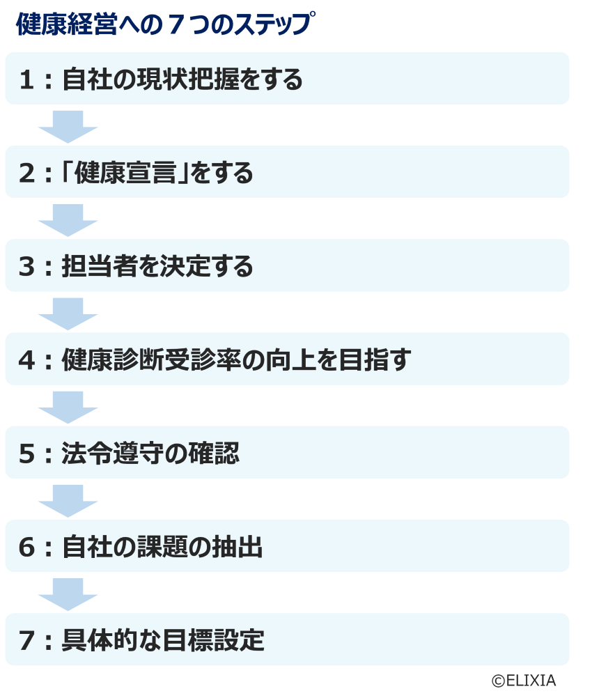ヒトは会社の大事な資産!「健康経営」はメリットがたくさん 2022/04/22 2024/04/22 健康管理 健康経営とは?考え方から企業が取り組むメリット、はじめの一歩まで徹底解説! 皆さんは「健康経営」という言葉を耳にしたことはあるでしょうか?近年、健康経営の注目度が高まっているため、一度は耳にしたことがあるという方は多いかもしれません。しかし、「聞いたことはあるけど詳しくは知らない」「健康経営って本当に意味があるの?」と疑問を持っている方もいるかと思います。 そこで今回は健康経営とはどのようなものなのか、注目された背景やメリット、進めるうえでの準備など基本的な内容をわかりやすく解説していきます。 この記事でわかること(目次)健康経営とは?考え方から企業が取り組むメリット、はじめの一歩まで徹底解説!健康経営とは、ヒトを『資産』として投資をする考え方健康経営が注目された3つの理由健康経営はいいことだらけ!?健康経営のメリットとは?健康経営を推進するメリット‐会社側健康経営を推進するメリット‐従業員側健康経営はじめの一歩事前準備から始める、健康経営への7つのステップまとめ健康経営とは、ヒトを『資産』として投資をする考え方 健康経営とは、「従業員等の健康管理を経営的な視点で考え、戦略的に実践すること」です。 通常、従業員は人件費という「費用」で計上しますが、健康経営は従業員を「資産」ととらえ、従業員の健康の維持・増進を「投資」とする考え方です。具体的に言うと、従業員のメンタルヘルス等の健康づくりに積極的に取り組むことで、従業員の活力向上や業務の効率化を図り、会社全体の生産性の向上を促進します。結果的に、業績向上や株価向上につながります。 この「健康経営」という考え方は、近年注目度が上がっており、取り組む会社が増えています。次の項から健康経営が注目された理由や取り組むメリットなどを解説していきます。 健康経営が注目された3つの理由 健康経営が注目される以前までは、従業員の健康問題は経営上の問題とは考えず、従業員個人で解決すべき問題として考えられていました。しかし近年、人口構造の変化や社会情勢の変化により経営と従業員の健康は切っても切り離せない問題となりました。限りのある重要な財産である従業員の健康を守ることは、会社経営にとって大きな意義があるのです。健康経営が注目されるようになった理由は様々ありますが、主なものを3つご紹介します。 理由1:少子高齢化社会に伴う労働人口の減少による生産性への影響 現在、日本の総人口に占める65歳以上人口の割合は、約3割※1との結果が出ています。既知の通り、日本は少子高齢化社会となっており、生産年齢人口(15歳~64歳)も減少傾向にあります。2070年には2.6人に1人が65歳以上、4人に1人が75歳以上との推計も出ています。 そのような中で、企業が生産性を維持するためには、労働者一人一人の生産性を上げていかなければなりません。 そのため、従業員が元気に長く働けるようサポートし、生産性を下げる要因の一つである「健康状態」を良好にすることで、会社全体の生産性を維持していく取り組みが求められます。その取り組みとして、いま健康経営が注目されています。 また今後、労働人口が減少していく中で人手を確保していくために、高齢就業者の活用を増やすことが予想されます。高齢者は健康問題を抱えていることが多いため、生産性維持を目的とした健康配慮は、企業にとってさらに重要となってきます。 *1内閣府 令和5年版高齢社会白書 参考:総務省統計局:高齢者の就業 理由2:人手不足による労働環境と健康への影響 労働人口の減少による人手不足は労働環境にも大きな影響をもたらしています。「働き方改革」により、時間外労働を減らしていこうとする取り組みが進められている一方で、業種によっては、人手不足の影響で労働者1人あたりの業務量が増加し、時間外労働をせざるを得ない状態も見られています。時間外労働は労働者の心身の負担に影響するだけでなく、健康問題や労働災害の発生リスクも高まると言われています。さらに、時間外労働の常態化は健康状態に影響を及ぼすだけでなく、精神的余力低下に伴う職場雰囲気の悪化、健康状態悪化による従業員の離脱、労働環境の悪評による求職者の減少を招き、やがて業務継続にも影響を及ぼしかねません。労働環境を見直し、事業継続性を担保していくうえでも、健康経営は重要な経営施策の一つとして注目されています。 理由3:少子高齢化社会における財源の減少と医療費の増加 医療費の増加は身近に感じにくい課題ですが、医療費は現役世代によって賄われています。そのため必然的に労働人口が減れば、財源も減ることは言うまでもありません。 その中で現在、医療費が年々増大している状況にあります。医療費を圧迫している原因は、主に高齢化にあります。現状のままでは、財源は減るのに医療費が年々増大し、