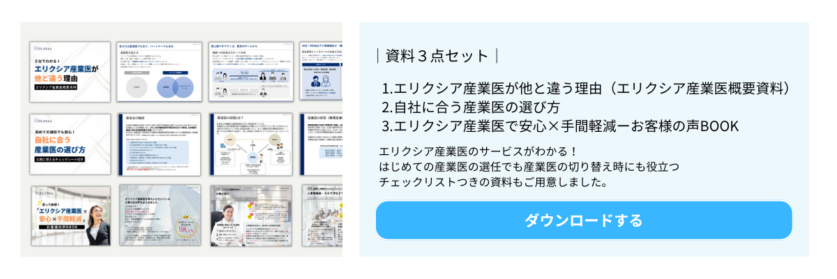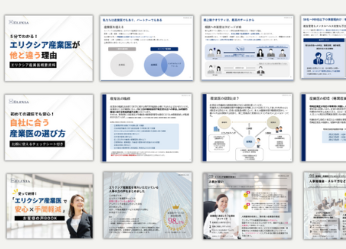 産業保健や健康管理について大事な情報がすぐ手に入る。専門家も使っているチェックリストやフォーマットもお手元で確認。人事のお仕事に役立つ資料を集めました。 エリクシアがわかる資料3点セット |資料3点セット| エリクシア産業医が他と違う理由(エリクシア産業医概要資料)自社に合う産業医の選び方エリクシア産業医で安心×手間軽減―お客様の声BOOK エリクシア産業医のサービスがわかる!はじめての産業医の選任でも産業医の切り替え時にも役立つチェックリストつきの資料もご用意しました。 ダウンロードする 産業保健・健康管理お役立ちノウハウ資料 ダウンロードする ダウンロードする ダウンロードする ダウンロードする ダウンロードする ダウンロードする ダウンロードする ダウンロードする ダウンロードする ダウンロードする ダウンロードする セミナー情報 問い合わせる