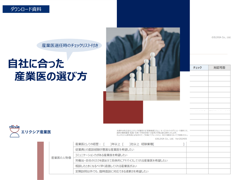 産業医の役割や業務内容、産業医の選び方についてまとめた資料です。産業医選任時のチェックリスト付きです。ご活用ください。フォーム送信後にダウンロードURLをお送りいたします。 お名前必須 フリガナ必須 メールアドレス必須 お電話番号必須 貴社名必須 部署名必須 対象従業員数必須 相談事項必須 下記より当てはまるものをお選びください。 従業員数50名越え(見込み含む)での新規選任の検討産業医の切り替えを検討不調者対応やトラブルケースへの対策を検討メンタルヘルス対策の強化を検討地方拠点を含めた全社の衛生管理を本社で統轄する体制の構築/運営を検討その他(下記詳細にご記入ください) 相談事項の詳細 当社のプライバシーポリシーについてご確認いただき、チェックの上、送信をお願いします。 プライバシーポリシーについて同意します エリクシア産業保健コラムトップ